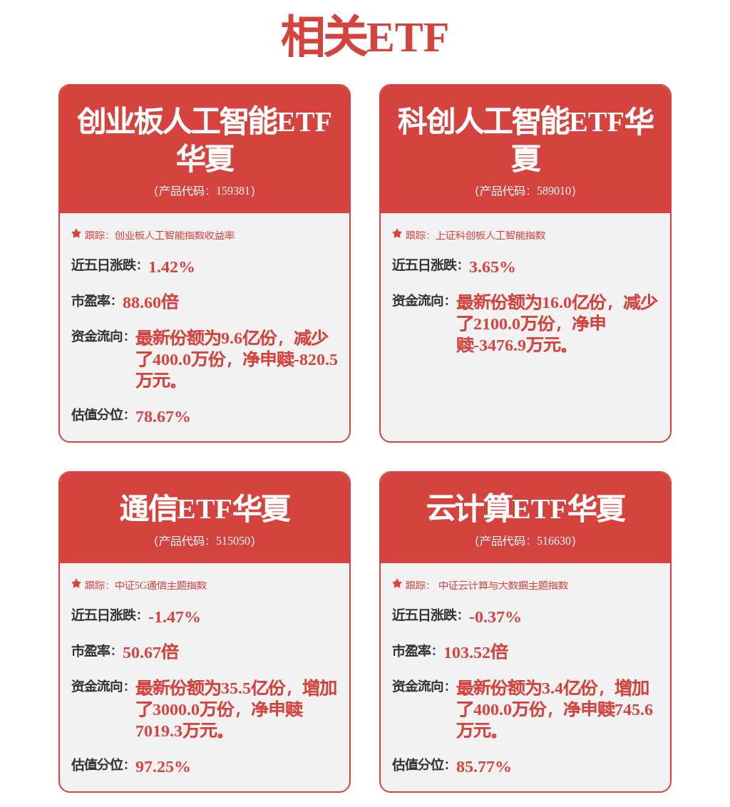 低费率创业板人工智能ETF华夏(159381)助力布局创业板AI主业公司。资料显示,该ETF跟踪指数一半权重在AI硬件算力(CPO),一半权重在AI软件应用(计算机、传媒、电子、军工),具备较高弹性和代表性。目前该ETF场内综合费率仅0.20%,位居同类最低。场外联接(A类:025505;C类:025506)