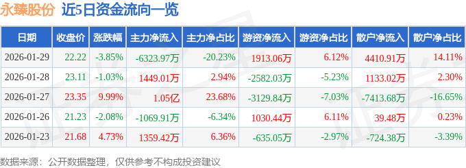 证券之星消息,截至2026年1月29日收盘,永臻股份(603381)报收于22.22元,下跌3.85%,换手率9.74%,成交量13.84万手,成交额3.13亿元。