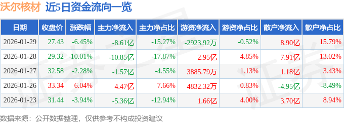 证券之星消息,截至2026年1月29日收盘,沃尔核材(002130)报收于27.43元,下跌6.45%,换手率17.55%,成交量200.86万手,成交额56.39亿元。