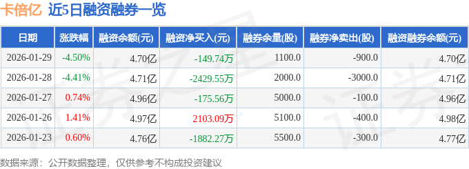 卡倍亿融资融券信息显示,融资方面,当日融资买入2661.82万元,融资偿还2811.56万元,融资净偿还149.74万元。融券方面,融券卖出100.0股,融券偿还1000.0股,融券余量1100.0股,融券余额6.05万元。融资融券余额4.7亿元。