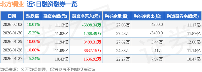 证券之星消息,截至2026年2月2日收盘,北方铜业(000737)报收于17.54元,下跌10.01%,跌停,换手率0.73%,成交量13.81万手,成交额2.42亿元。