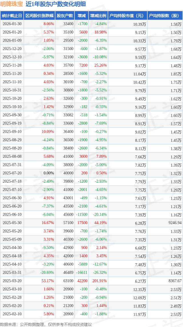 从股价来看,2026年1月20日至2026年1月30日,明牌珠宝区间涨幅为8.06%,在此期间股东户数减少1700.0户,减幅为4.84%。