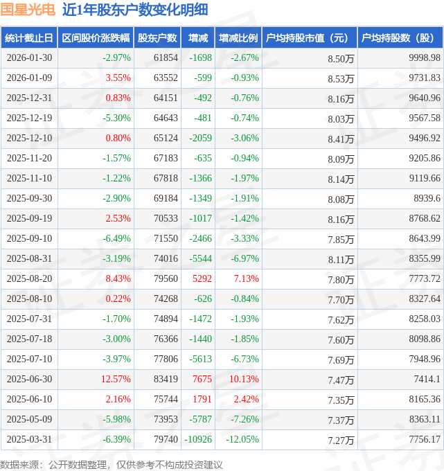 证券之星消息,近日国星光电披露,截至2026年1月30日公司股东户数为6.19万户,较1月9日减少1698.0户,减幅为2.67%。户均持股数量由上期的9732.0股增加至9999.0股,户均持股市值为8.5万元。