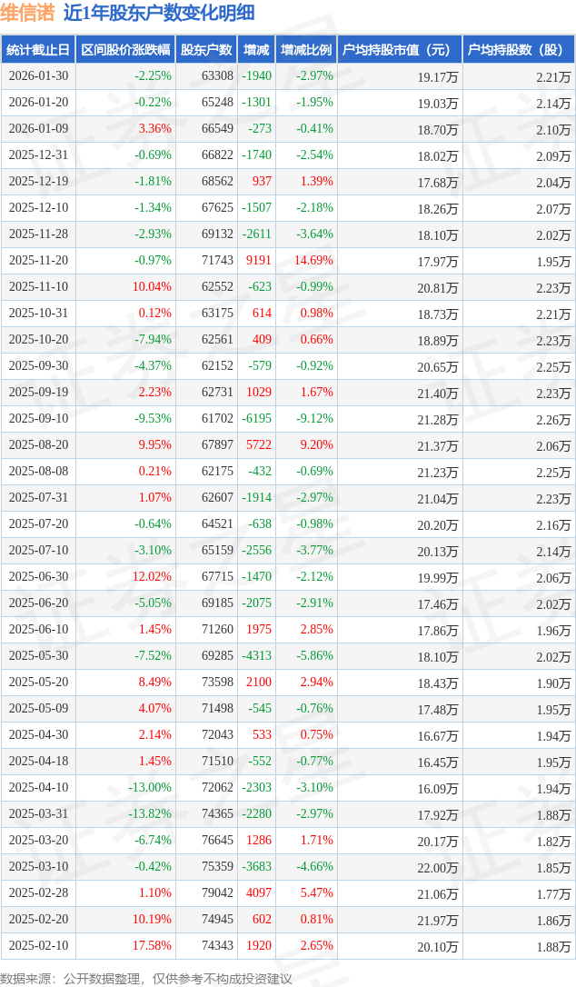 从股价来看,2026年1月20日至2026年1月30日,维信诺区间跌幅为2.25%,在此期间股东户数减少1940.0户,减幅为2.97%。
