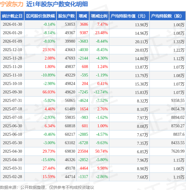 从股价来看,2026年1月20日至2026年1月30日,宁波东力区间跌幅为0.14%,在此期间股东户数增加3686.0户,增幅为7.47%。
