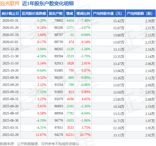 从股价来看,2026年1月20日至2026年1月31日,远光软件区间跌幅为5.29%,在此期间股东户数减少6454.0户,减幅为7.48%。