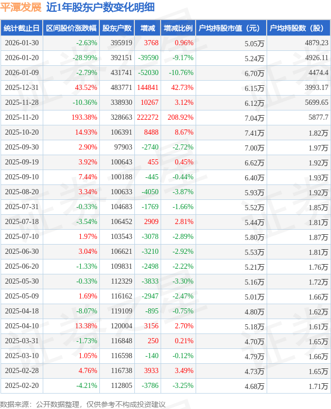 从股价来看,2026年1月20日至2026年1月30日,平潭发展区间跌幅为2.63%,在此期间股东户数增加3768.0户,增幅为0.96%。