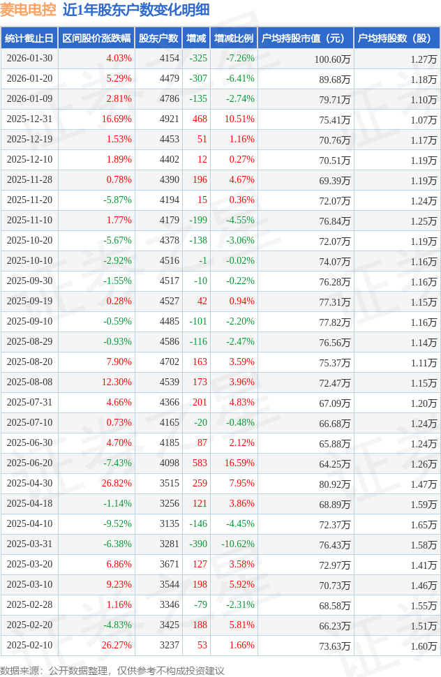 从股价来看,2026年1月20日至2026年1月30日,菱电电控区间涨幅为4.03%,在此期间股东户数减少325.0户,减幅为7.26%。