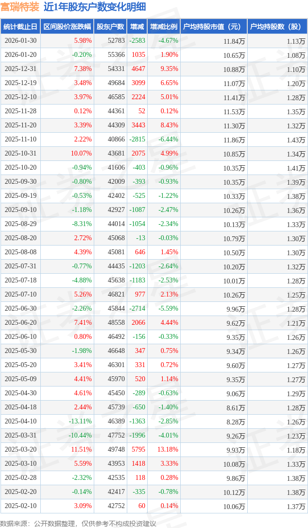从股价来看,2026年1月20日至2026年1月30日,富瑞特装区间涨幅为5.98%,在此期间股东户数减少2583.0户,减幅为4.67%。