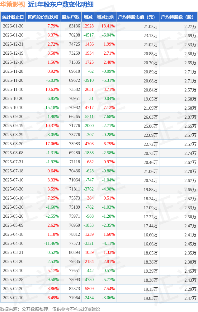 证券之星消息,近日华策影视披露,截至2026年1月30日公司股东户数为8.31万户,较1月20日增加1.29万户,增幅为18.41%。户均持股数量由上期的2.69万股减少至2.27万股,户均持股市值为21.05万元。