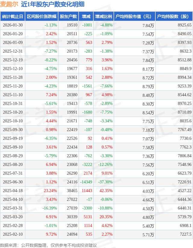 从股价来看,2026年1月20日至2026年1月30日,麦趣尔区间跌幅为1.13%,在此期间股东户数减少1001.0户,减幅为4.88%。