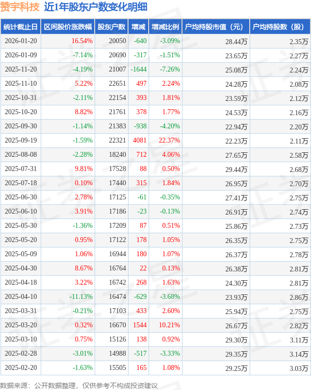 证券之星消息,近日赞宇科技披露,截至2026年1月20日公司股东户数为2.0万户,较1月9日减少640.0户,减幅为3.09%。户均持股数量由上期的2.27万股增加至2.35万股,户均持股市值为28.44万元。