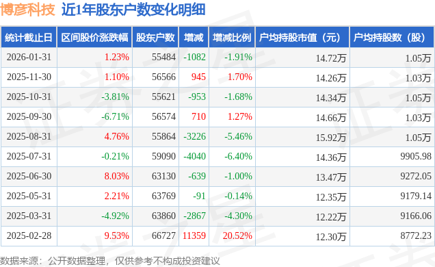 从股价来看,2025年11月30日至2026年1月31日,博彦科技区间涨幅为1.23%,在此期间股东户数减少1082.0户,减幅为1.91%。