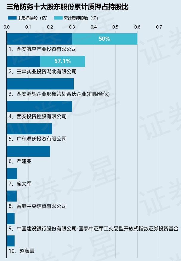 截止本公告日,股东西安航空产业投资有限公司已累计质押股份3000.0万股,占其持股总数的50.0%,股东三森实业投资湖北有限公司已累计质押股份2058.0万股,占其持股总数的57.1%。本次质押后三角防务十大股东的累计质押股份占持股比例(占持股比例的计算以公司最新一期财务报表公布的十大股东的持股总数为基准)见下图: