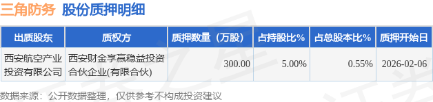 证券之星消息,三角防务(300775)2月9日公开信息显示,股东西安航空产业投资有限公司向西安财金享赢稳益投资合伙企业(有限合伙)合计质押300.0万股,占总股本0.55%。质押详情见下表: