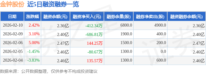 金钟股份融资融券信息显示,融资方面,当日融资买入1037.04万元,融资偿还1449.38万元,融资净偿还412.34万元。融券方面,融券卖出5100.0股,融券偿还200.0股,融券余量6800.0股,融券余额27.59万元。融资融券余额2.36亿元。