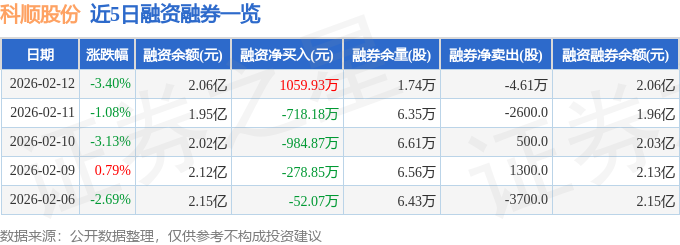 证券之星消息,截至2026年2月12日收盘,科顺股份(300737)报收于7.1元,下跌3.4%,换手率3.0%,成交量26.57万手,成交额1.9亿元。
