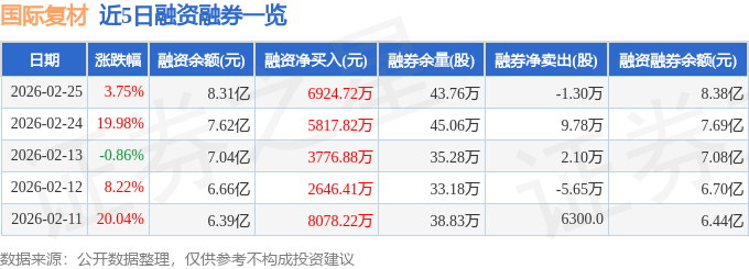 证券之星消息,截至2026年2月25日收盘,国际复材(301526)报收于15.76元,上涨3.75%,换手率23.26%,成交量326.63万手,成交额50.89亿元。