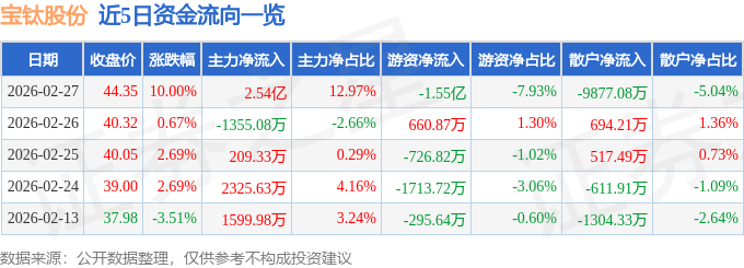 证券之星消息,宝钛股份2月27日涨停收盘,收盘价44.35元。该股于9点49分涨停,3次打开涨停,截止收盘封单资金为4426.06万元,占其流通市值0.21%。