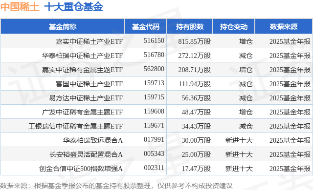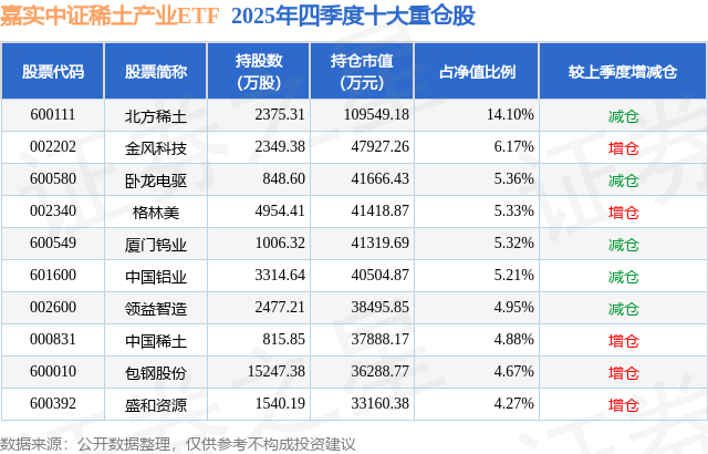 根据2025基金年报公募基金重仓股数据,重仓该股的公募基金共21家,其中持有数量最多的公募基金为嘉实基金的嘉实中证稀土产业ETF。嘉实中证稀土产业ETF目前规模为77.71亿元,最新净值2.215(2月26日),较上一交易日下跌0.73%,近一年上涨95.27%。该公募基金现任基金经理为田光远。田光远在任的基金产品包括:嘉实中证软件服务ETF,管理时间为2021年6月4日至今,期间收益率为-13.55%;嘉实中证电池主题ETF,管理时间为2021年7月13日至今,期间收益率为-12.97%;嘉实中证稀土产业ETF联接A,管理时间为2021年8月3日至今,期间收益率为52.76%。