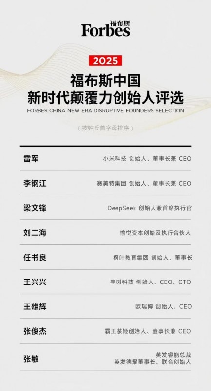 同期入选者包括小米科技创始人雷军、DeepSeek创始人梁文锋、宇树科技创始人王兴兴等科技领军者。我们与这些同行并肩,以各自的技术路径,共同诠释新质生产力的多元可能。