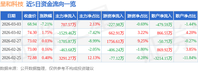 证券之星消息,截至2026年3月3日收盘,呈和科技(688625)报收于68.94元,下跌7.21%,换手率2.51%,成交量4.72万手,成交额3.33亿元。