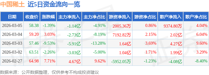 证券之星消息,截至2026年3月5日收盘,中国稀土(000831)报收于58.38元,下跌1.39%,换手率3.71%,成交量39.39万手,成交额23.19亿元。