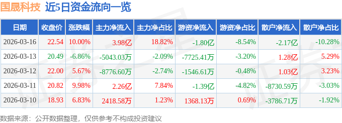 证券之星消息,国晟科技3月16日涨停收盘,收盘价22.54元。该股于10点20分涨停,1次打开涨停,截止收盘封单资金为1.03亿元,占其流通市值0.71%。