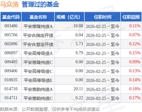 马众浩先生:中国国籍,伦敦玛丽女王大学金融学专业硕士。曾任大成基金管理有限公司债券交易员。2018年11月加入平安基金管理有限公司,历任基金运营部交易室交易经理、固定收益投资中心研究部高级研究员。2026年2月25日担任平安合慧定期开放纯债债券型发起式证券投资基金、平安合瑞定期开放债券型发起式证券投资基金、平安惠隆纯债债券型证券投资基金、平安高等级债债券型证券投资基金、平安惠韵纯债债券型证券投资基金基金经理。