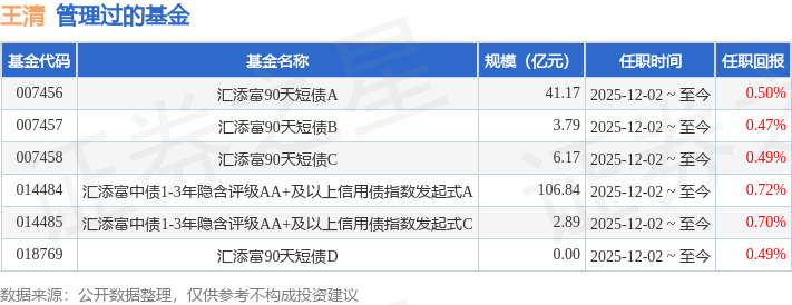 王清女士:国籍中国。学历、学位:研究生学历、硕士学位。2016年7月至2017年4月任国金证券固收研究员,2017年5月至2021年2月任东方证券固定收益分析师。2021年3月加入汇添富基金管理股份有限公司任投资经理。2023年10月30日至今任汇添富稳鑫120天滚动持有债券的基金经理助理。2023年10月30日至今任汇添富淳享一年定开债券发起式的基金经理助理。2023年10月30日至2025年12月02日任汇添富90天短债的基金经理助理。2023年10月30日至今任汇添富双享回报债券的基金经理助理。2023年10月30日至今任汇添富稳进双盈一年持有混合的基金经理助理。2023年10月30日至今任汇添富稳健睿享一年持有混合的基金经理助理。2023年12月12日至今任汇添富稳鑫90天持有债券的基金经理助理。2025年08月19日至2025年12月02日任汇添富中债1-3年隐含评级AA+及以上信用债指数发起式的基金经理助理。2025年12月02日起担任汇添富90天滚动持有短债债券型证券投资基金、汇添富中债-市场隐含评级AA+及以上信用债(1-3年)指数发起式证券投资基金基金经理。