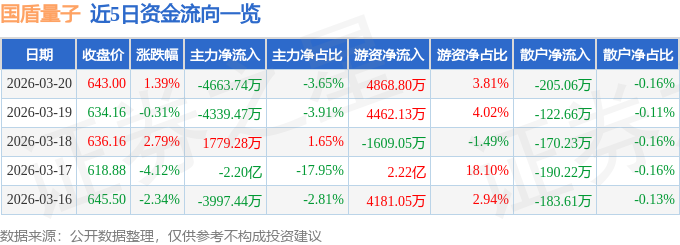 证券之星消息,截至2026年3月20日收盘,国盾量子(688027)报收于643.0元,上涨1.39%,换手率2.48%,成交量1.99万手,成交额12.79亿元。