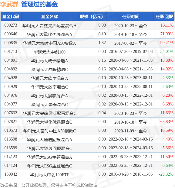 李武群先生:中国,博士研究生。2009年7月至2010年6月担任中信银行福州分行统计分析岗;2010年6月至2015年8月担任华西证券股份有限公司研究所高级研究员、股票投资部投资经理助理;2015年8月正式加入华润元大基金管理有限公司,现任量化指数部总经理;2017年8月2日起担任华润元大富时中国A50指数型证券投资基金基金经理;2019年10月18日起担任华润元大量化优选混合型证券投资基金基金经理。2020年4月8日至2021年11月3日担任华润元大成长精选股票型发起式证券投资基金基金经理。2020年8月13日担任华润元大景泰混合型证券投资基金基金经理。2020年10月23日担任华润元大安鑫灵活配置混合型证券投资基金基金经理。2020年10月23日担任华润元大欣享混合型发起式证券投资基金基金经理。现任华润元大富时中国A50指数型证券投资基金、华润元大景泰混合型证券投资基金、华润元大安鑫灵活配置混合型证券投资基金、华润元大臻选回报混合型证券投资基金基金经理。