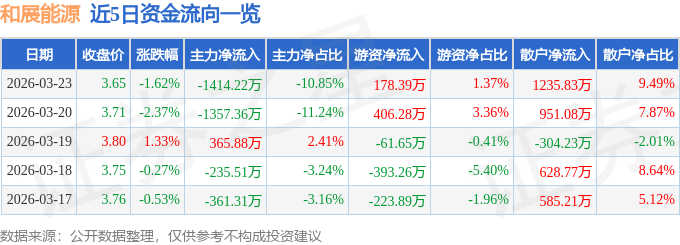 证券之星消息,截至2026年3月23日收盘,和展能源(000809)报收于3.65元,下跌1.62%,换手率4.3%,成交量35.48万手,成交额1.3亿元。