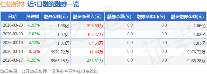 证券之星消息,截至2026年3月23日收盘,仁信新材(301395)报收于14.72元,下跌1.93%,换手率4.34%,成交量5.59万手,成交额8308.08万元。