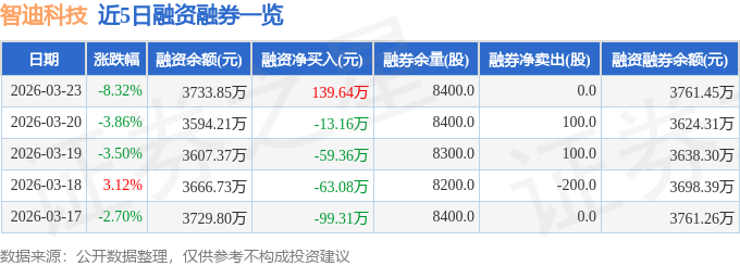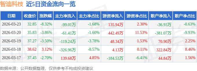 证券之星消息,截至2026年3月23日收盘,智迪科技(301503)报收于32.85元,下跌8.32%,换手率5.4%,成交量1.75万手,成交额5906.93万元。