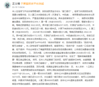证券之星注意到,此次约谈正值“3·15”国际消费者权益日来临前夕,是监管部门针对互联网助贷行业乱象的一次集中整治,也将信用飞长期存在的合规问题又一次推向公众视野。此前,吉林方女士“从未在信用飞平台借款,却遭持续暴力催收”事件引发舆论广泛关注,暴露了平台在个人信息保护、催收管理上的漏洞。