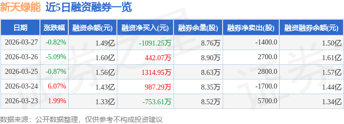 证券之星消息,截至2026年3月27日收盘,新天绿能(600956)报收于9.62元,下跌0.82%,换手率2.01%,成交量47.09万手,成交额4.5亿元。