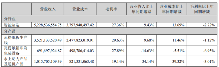 毛利率方面,2025年,瓦楞纸板生产线毛利率为29.63%,同比减少1.12个百分点;其他国家地区的毛利率为29.69%,同比减少1.72个百分点。