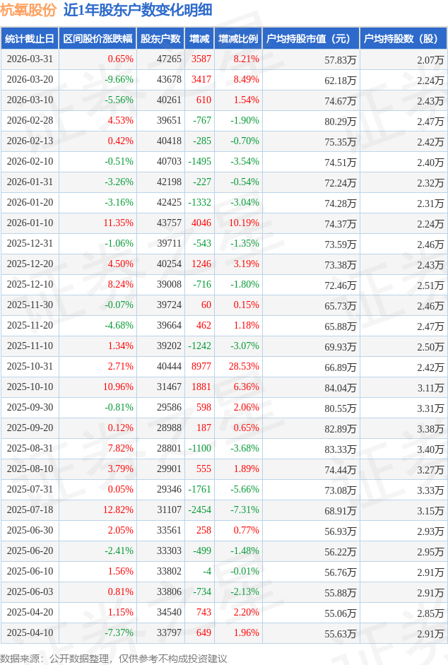 从股价来看,2026年3月20日至2026年3月31日,杭氧股份区间涨幅为0.65%,在此期间股东户数增加3587.0户,增幅为8.21%。