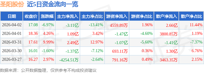 证券之星消息,截至2026年4月2日收盘,圣阳股份(002580)报收于17.08元,下跌6.97%,换手率29.64%,成交量134.08万手,成交额23.23亿元。