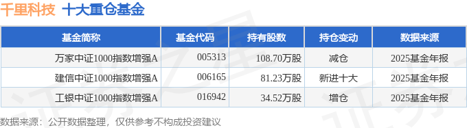 持有千里科技最多的基金为万家中证1000指数增强A,目前规模为8.86亿元,最新净值1.5217(4月3日),较上一交易日下跌1.29%,近一年上涨34.75%。该基金现任基金经理为乔亮。