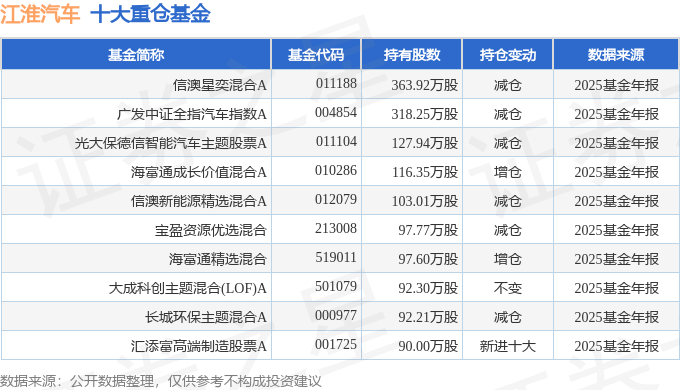 持有江淮汽车最多的基金为信澳星奕混合A,目前规模为14.45亿元,最新净值1.2615(4月3日),较上一交易日下跌0.94%,近一年下跌6.64%。该基金现任基金经理为李博。