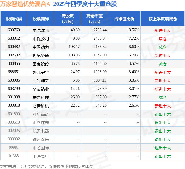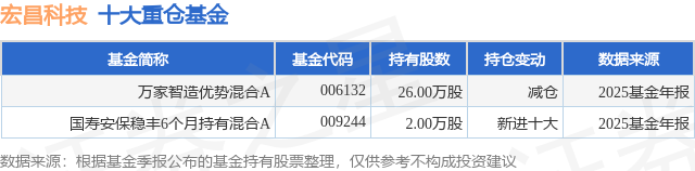 根据2025基金年报公募基金重仓股数据,重仓该股的公募基金共2家,其中持有数量最多的公募基金为万家基金的万家智造优势混合A。万家智造优势混合A目前规模为2.92亿元,最新净值3.0444(4月3日),较上一交易日下跌0.58%,近一年上涨23.49%。该公募基金现任基金经理为张希晨。张希晨在任的基金产品包括:万家先进制造混合发起式A,管理时间为2023年3月31日至今,期间收益率为28.75%;