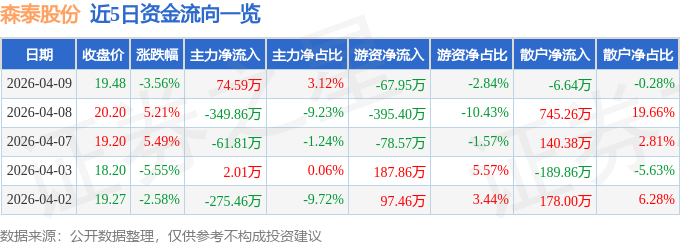 证券之星消息,截至2026年4月9日收盘,森泰股份(301429)报收于19.48元,下跌3.56%,换手率2.77%,成交量1.22万手,成交额2389.17万元。