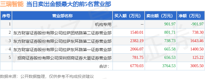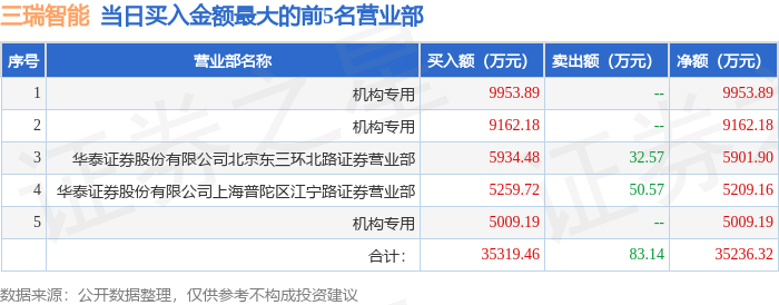 证券之星消息,沪深交易所2026年4月10日公布的交易公开信息显示,三瑞智能(301696)因无价格涨跌幅限制的证券登上龙虎榜。此次是近5个交易日内第1次上榜。