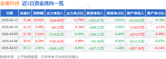 证券之星消息,截至2026年4月13日收盘,金富科技(003018)报收于35.48元,上涨10.02%,换手率5.79%,成交量13.75万手,成交额4.7亿元。