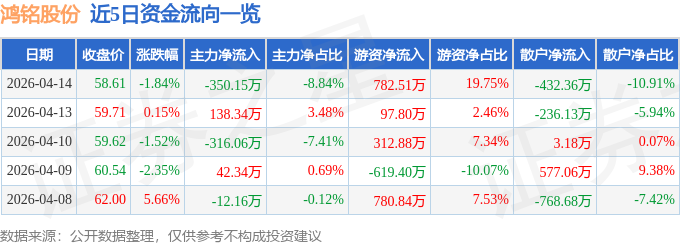 证券之星消息,截至2026年4月14日收盘,鸿铭股份(301105)报收于58.61元,下跌1.84%,换手率4.09%,成交量6727.0手,成交额3961.55万元。