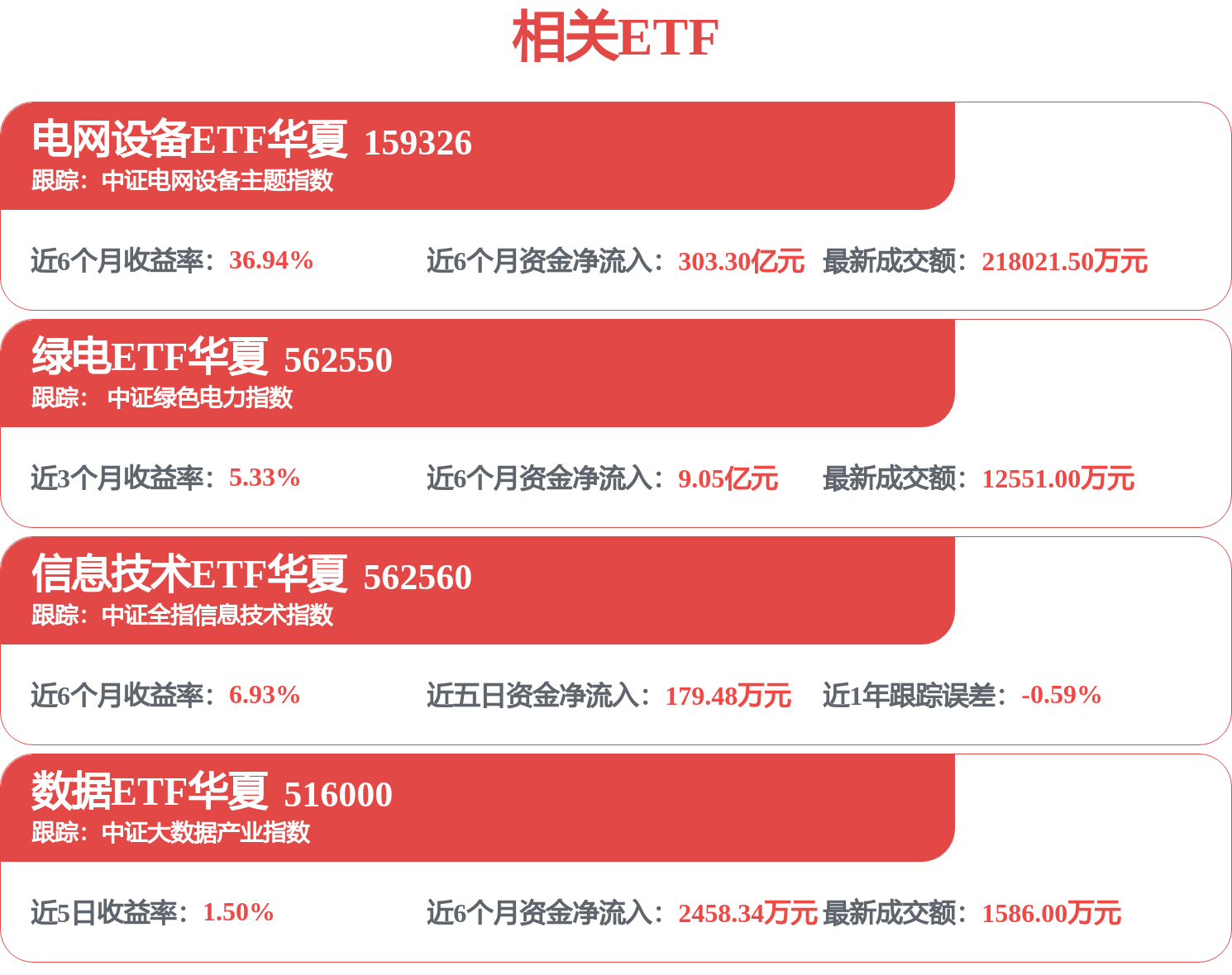 电网设备ETF华夏(159326):全市场唯一跟踪中证电网设备主题指数的产品,申万二级行业中电网设备含量超75%,为全市场最“纯”的电网指数;其中智能电网权重占比高达90%,特高压权重占比高达70%,均居全市场首位。产品全面覆盖国电南瑞、特变电工、思源电气等全产业链龙头,精准贴合特高压工程推进、智能电网升级、AI算力配套电网改造三大主线,是便捷把握电网设备行业高景气的核心工具。