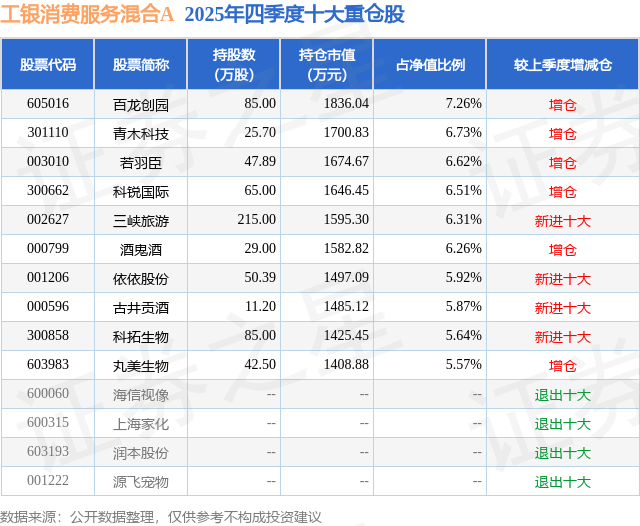 根据2025基金年报公募基金重仓股数据,重仓该股的公募基金共4家,其中持有数量最多的公募基金为工银瑞信基金的工银消费服务混合A。工银消费服务混合A目前规模为1.78亿元,最新净值2.441(4月15日),较上一交易日上涨0.62%,近一年下跌6.73%。该公募基金现任基金经理为林梦。林梦在任的基金产品包括:工银新生代消费混合,管理时间为2018年7月27日至今,期间收益率为54.8%;