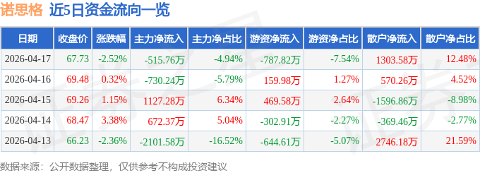 证券之星消息,截至2026年4月17日收盘,诺思格(301333)报收于67.73元,下跌2.52%,换手率1.59%,成交量1.54万手,成交额1.04亿元。